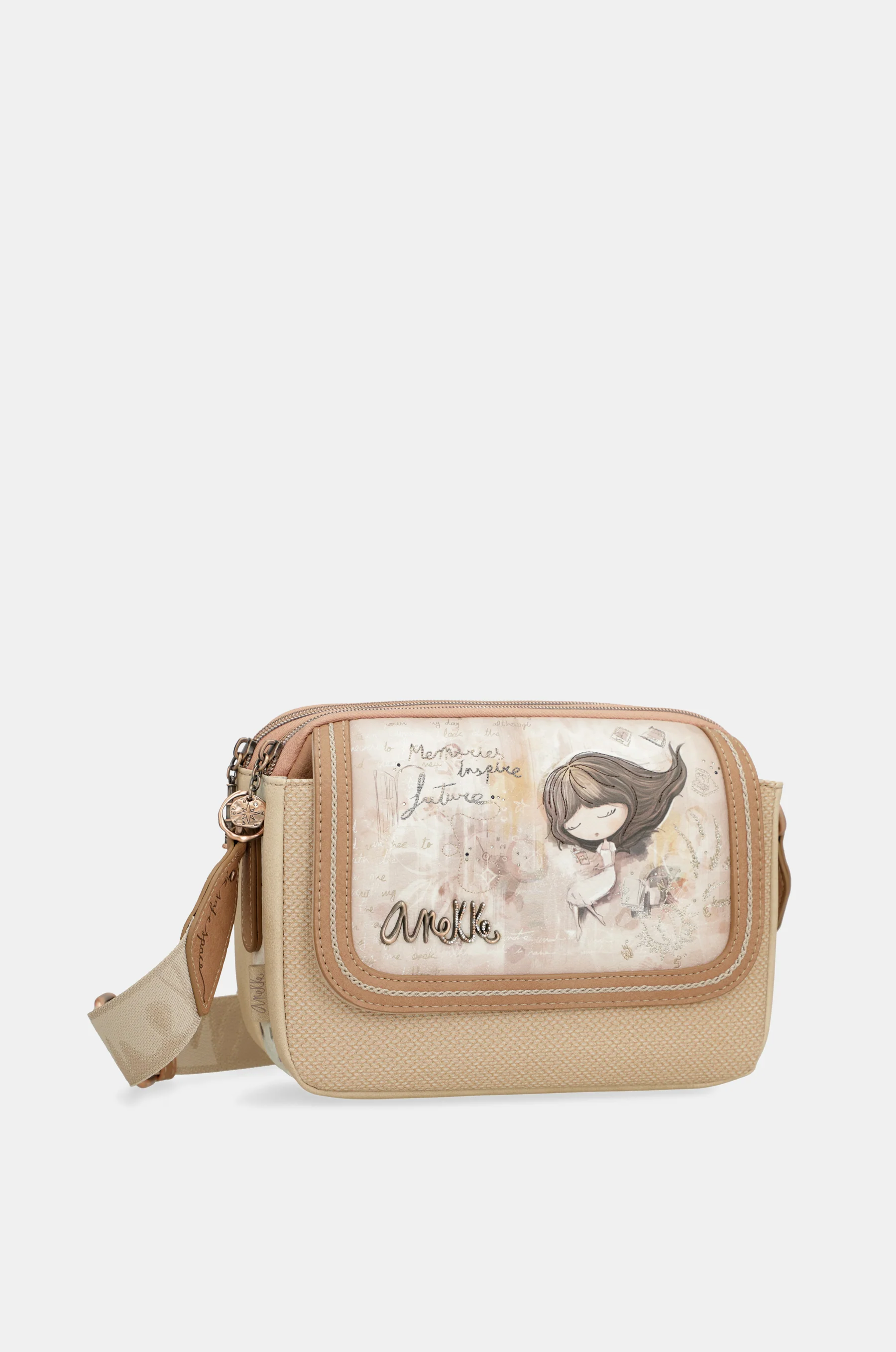 Anekke Memories is a collection built around Anekkeās memories. Itās a journey through some of the brandās most iconic collections, represented in the print on the front with nods to their characteristic elements. A lighthouse from Mediterranean, the sun and stars from Universe, the suitcase from Travel, or the books from Jane will take you on a journey through Anekkeās memories. Are you ready to start this journey into Anekkeās past? The more you look at the print, the more collections youāll discover. Start your journey into Anekkeās past here! This flap crossbody bag has 3 separate compartments, is medium-large in size and has a back pocket. The handle is a shoulder strap adjustable to different lengths, perfect for adapting it to your preferred height. The interior is lined and has pockets. Because memories inspire the future, get ready to enjoy them with Anekke!
