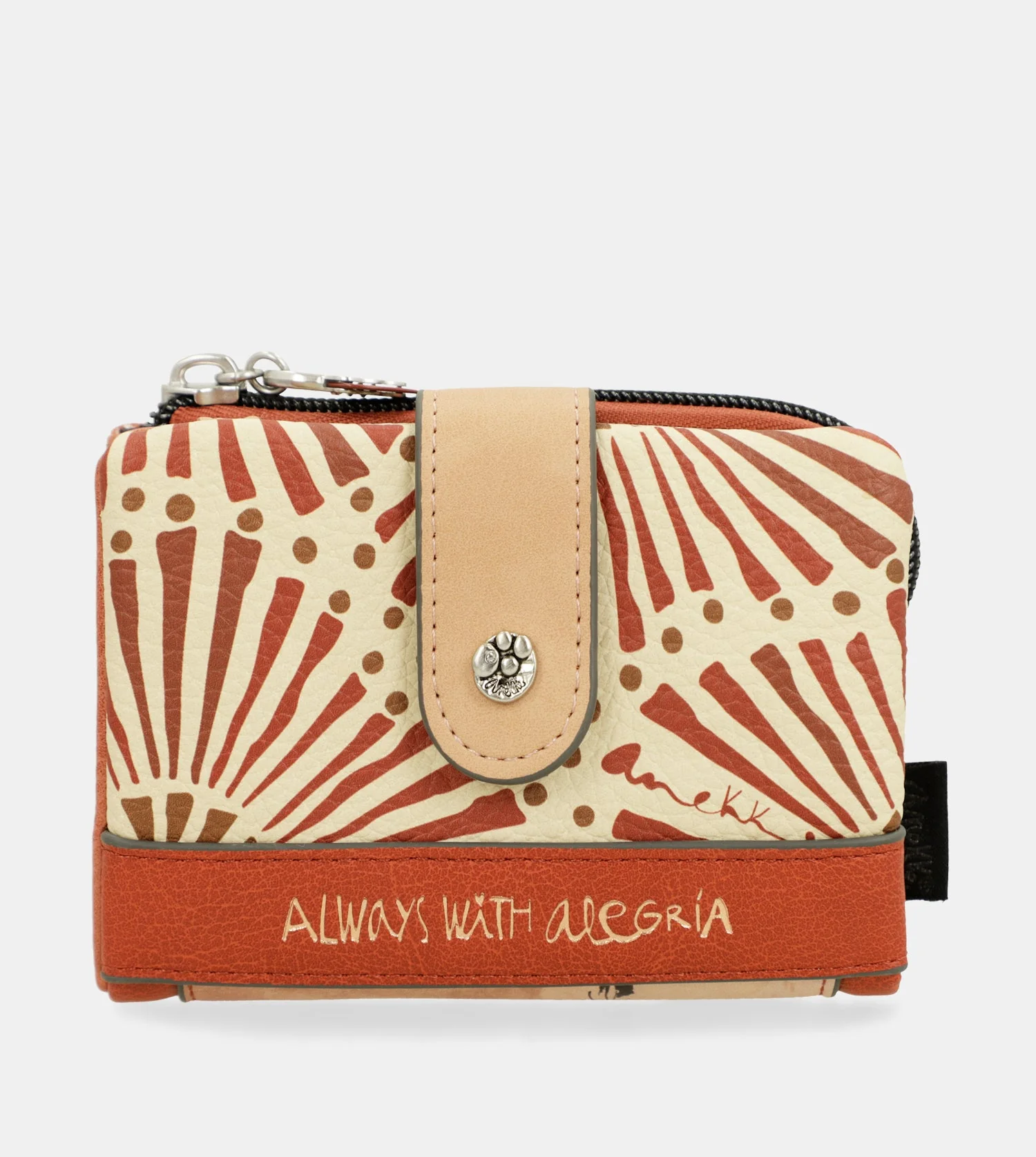 Anekke Alma is a collection inspired by a journey through Anekkeās homeland: Spain. Every small detail is inspired by the roots, culture, and richness of Spain. Reinterpreted polka dots and fans, cheerful colors, and countless nods to our traditions will be your ticket to a journey like no other: with soul. This medium-sized wallet is made of flexible material, has two main compartments: the back, where you will find a large billfold and space for banknotes and/or cards. It has a zip at the top, and inside you can keep coins. The entire interior is lined. It is, without a doubt, a tribute to the country that saw Anekke grow up. Because there are journeys made with the soul, and this one begins in the country Anekke calls home. Ready to dance with soul? Get your new favorite now!